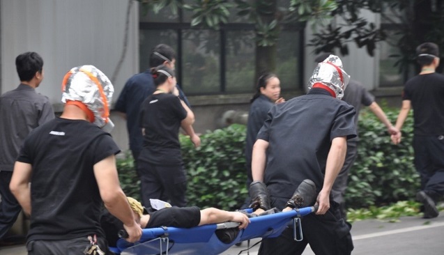 成立搜救小組對廠區(qū)內未及時逃離火災的“受傷受困”人員進行搜救,經過仔細尋找搜索,成功搜救出一名受困者,用擔架將其抬出,抬至安全集散地先進行初步“搶救”。目的是為了培養(yǎng)員工的搜救技能,以及安全意識。