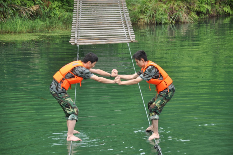 要講到刺激,要說的就是“雙人走鋼絲”了,在湖中設置兩根鋼絲,兩個團隊成員互相攙扶、平衡、配合水中走鋼絲,稍不留意就有落水的風險。既考驗了身體的平衡與柔韌性,更重要的是要有大無畏的精神和勇氣去挑戰,展現一個全新的自己。