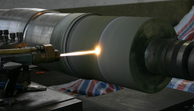 另一種方法是把燃料和氧氣通過高壓噴射,在噴嘴外燃燒,噴射熱噴涂粉末用高壓氣體從噴嘴內軸向送入火焰中,然后通過嘴外空氣罩中的壓縮氣體將燃燒火焰壓縮、加速,并將熔融的熱噴涂粉末噴向基板。